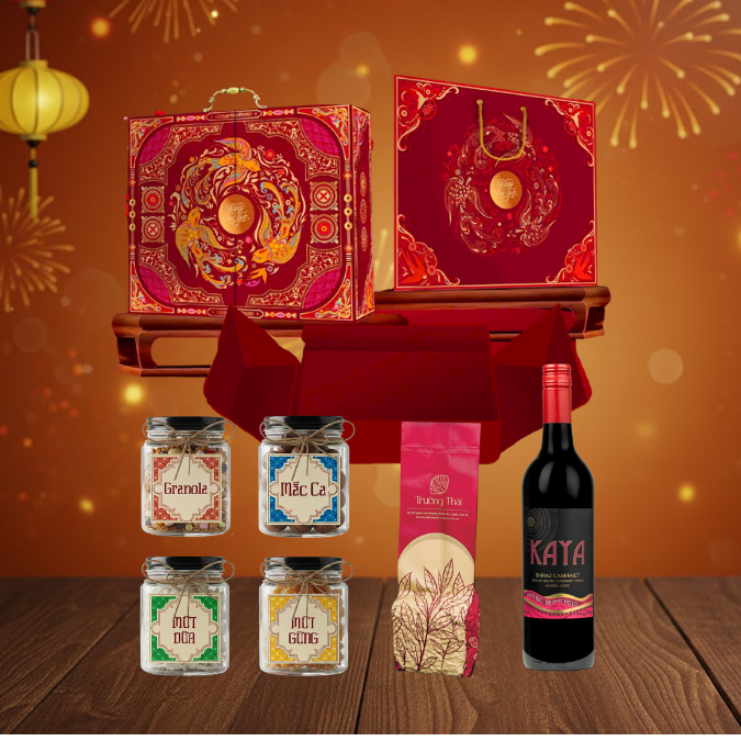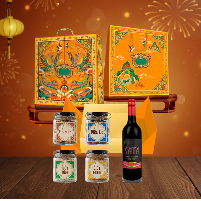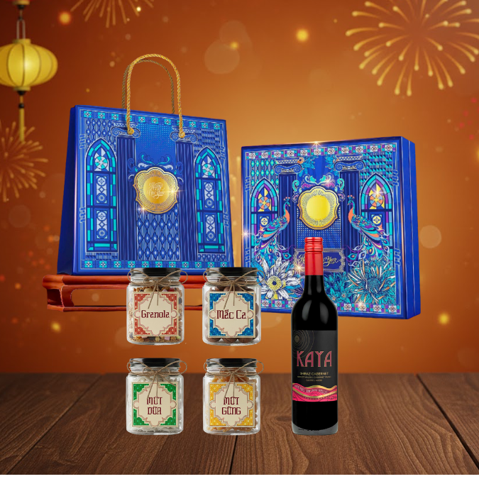 - Tinh hoa Rượu Vang: Mỗi set quà cao cấp đều có sự hiện diện của chai Rượu Vang Úc Kaya Shiraz Cabernet 750ml, biểu tượng của lời chúc phồn thịnh và sung túc.